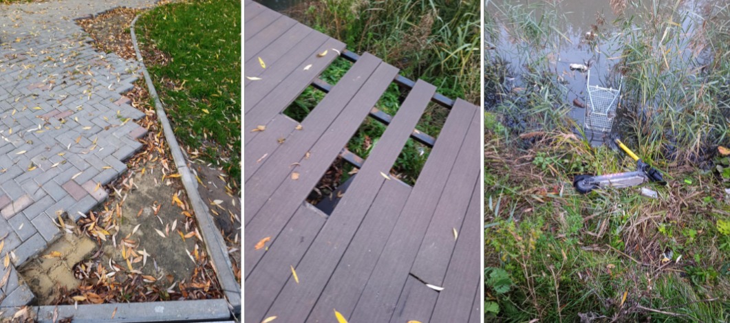 На кадрах — разломанный мост, испорченная пешеходная дорожка, выброшенные тележка и самокат.